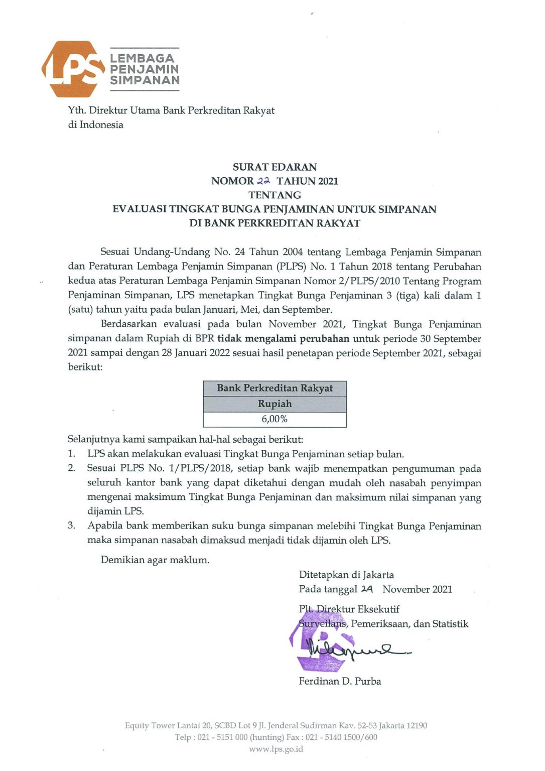 Berikut adalah Surat Edaran LPS Nomor 22 Tahun 2021